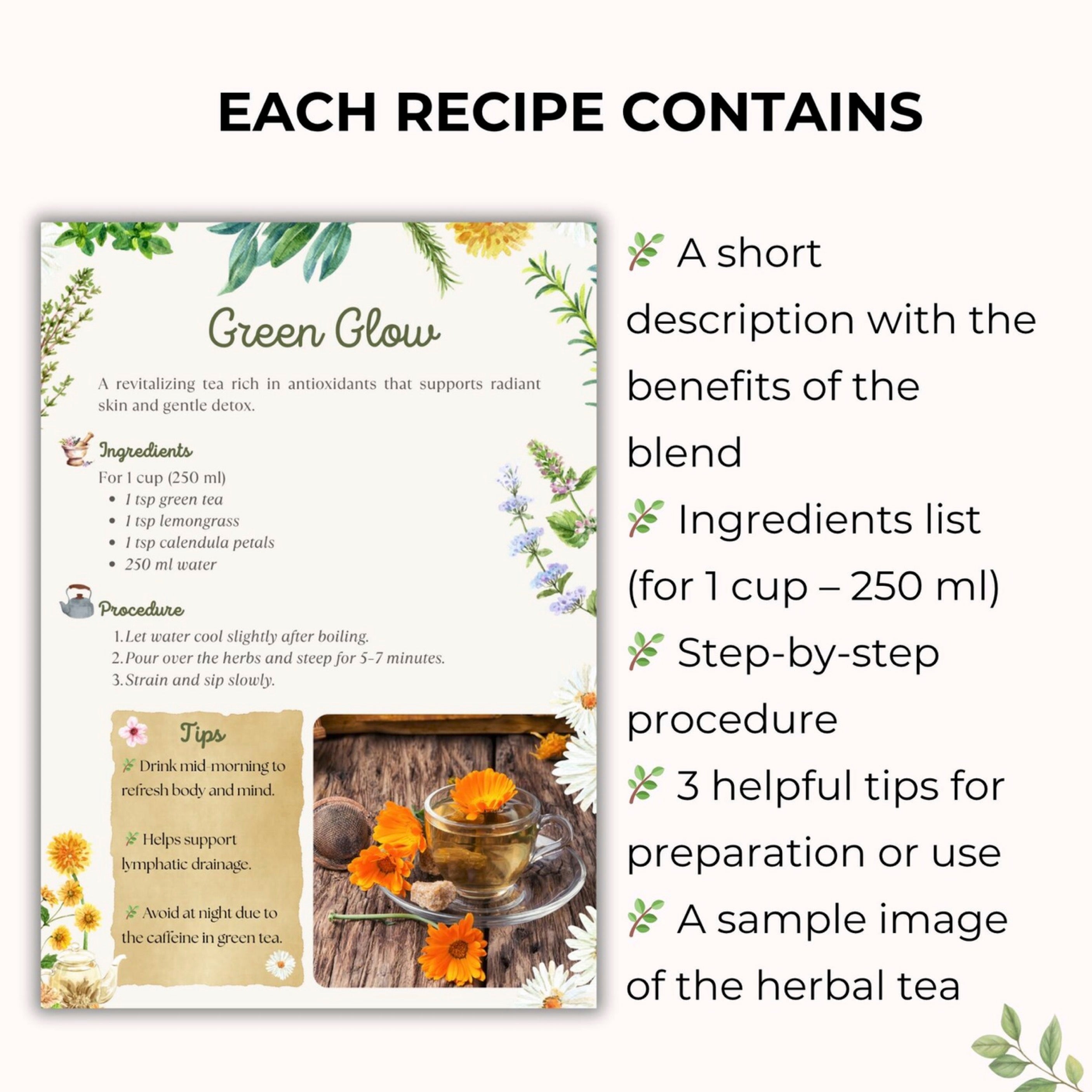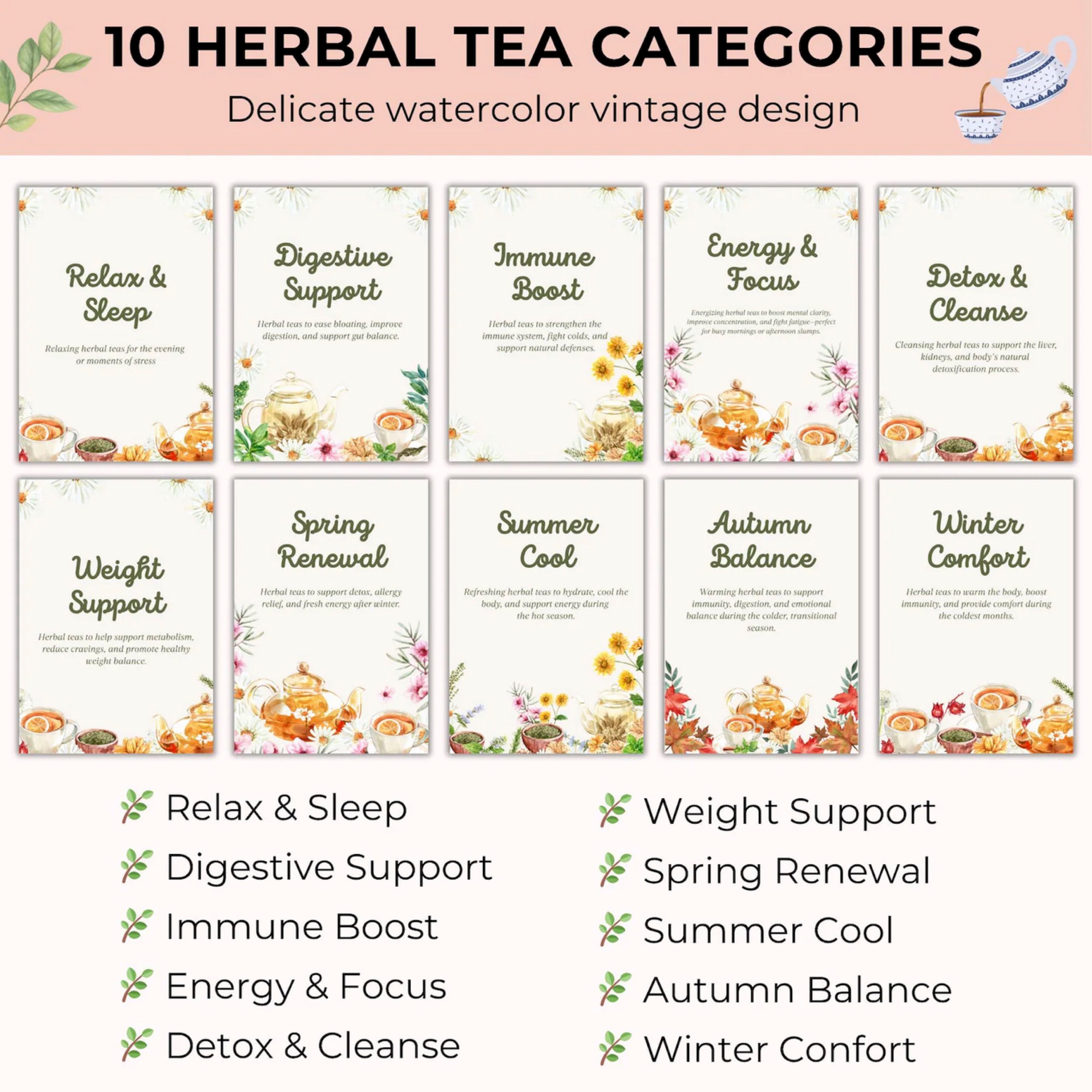 Perfect for tea lovers, wellness coaches, herbalists, and mindfulness practitioners, this collection helps you create soothing blends that bring balance, comfort, and wellness into every cup.