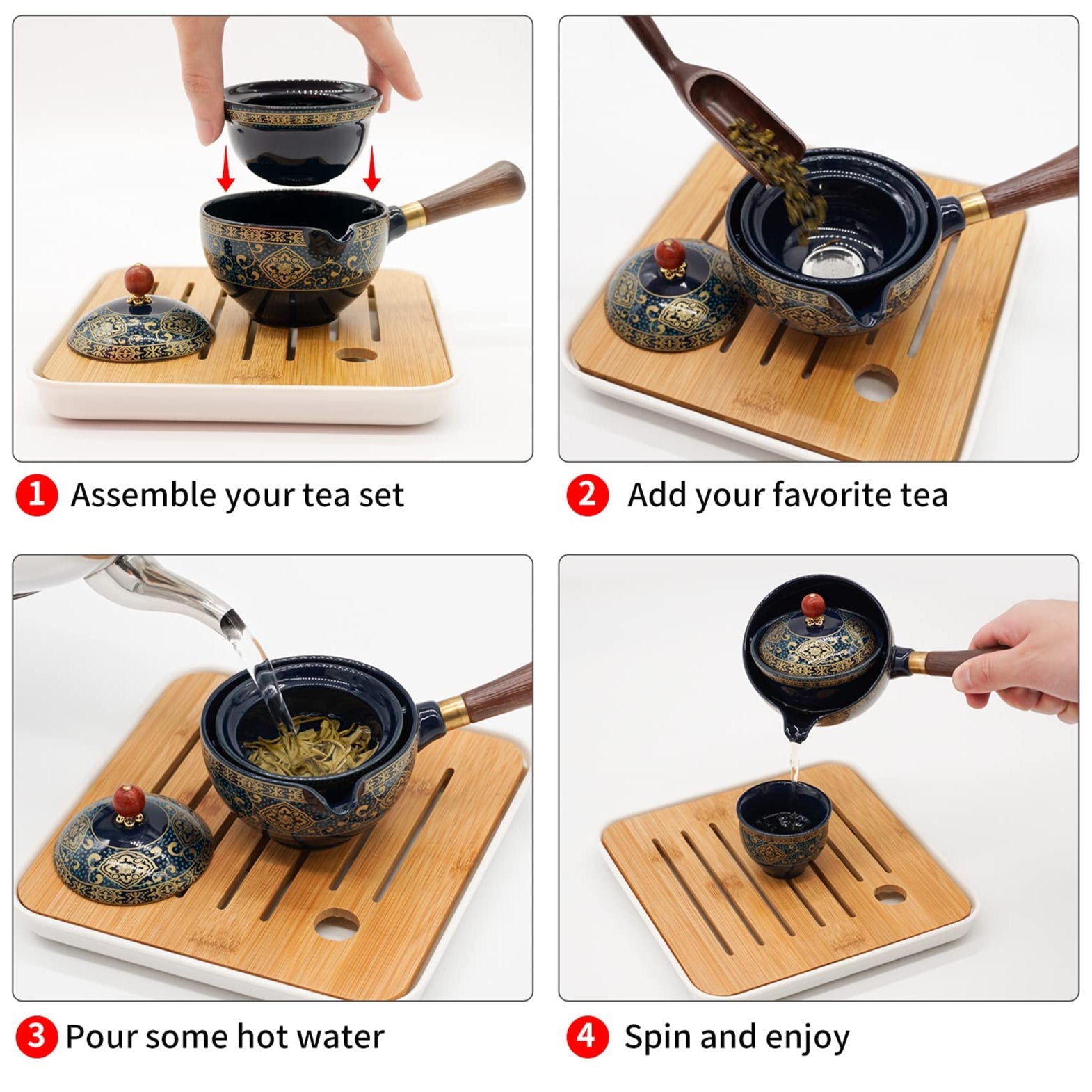 - Rotatable Teapot, 4 Teacups, Tea Tray and Travel Bag